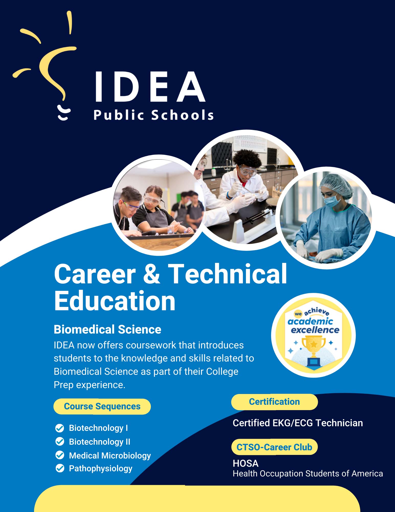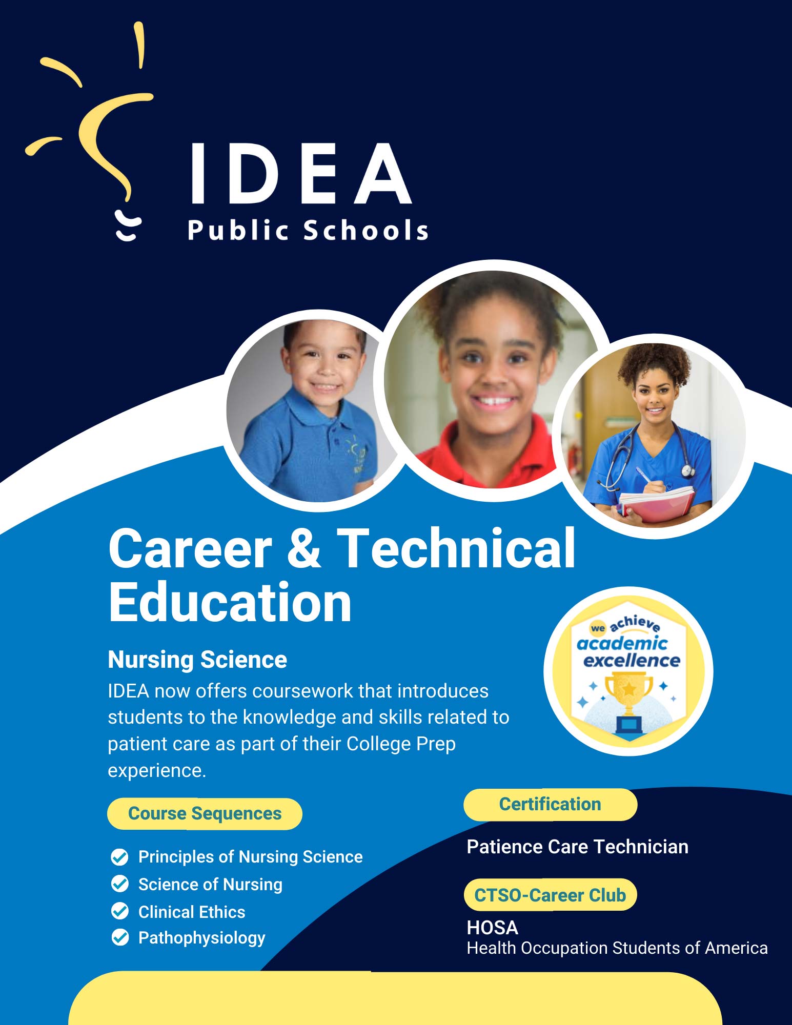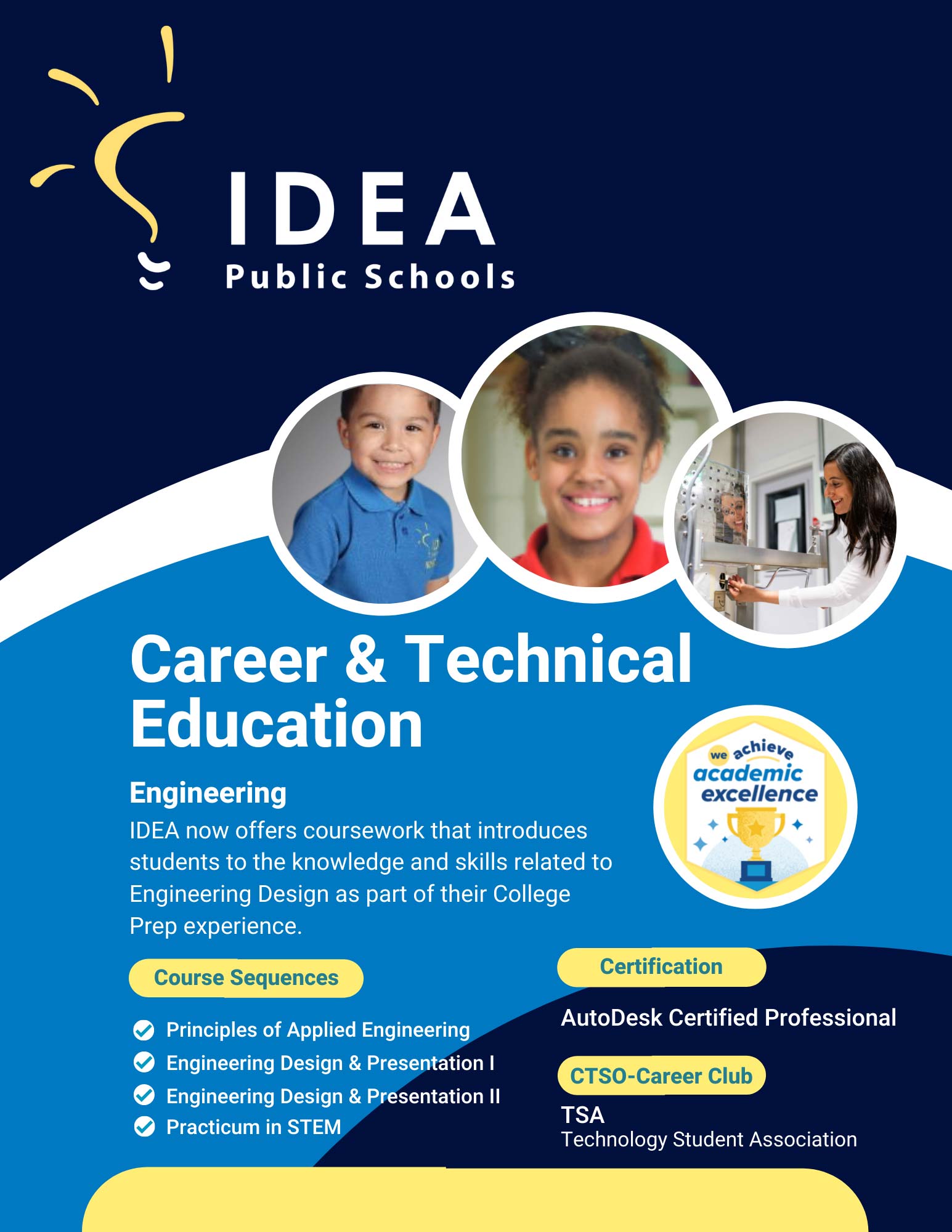 CTE at IDEA enhances our college for all mission, allowing students to explore career fields that mirror the job market and landscape of our nation’s economic growth. Students use these experiences to select the Major and University that will equip them for life beyond our classrooms.