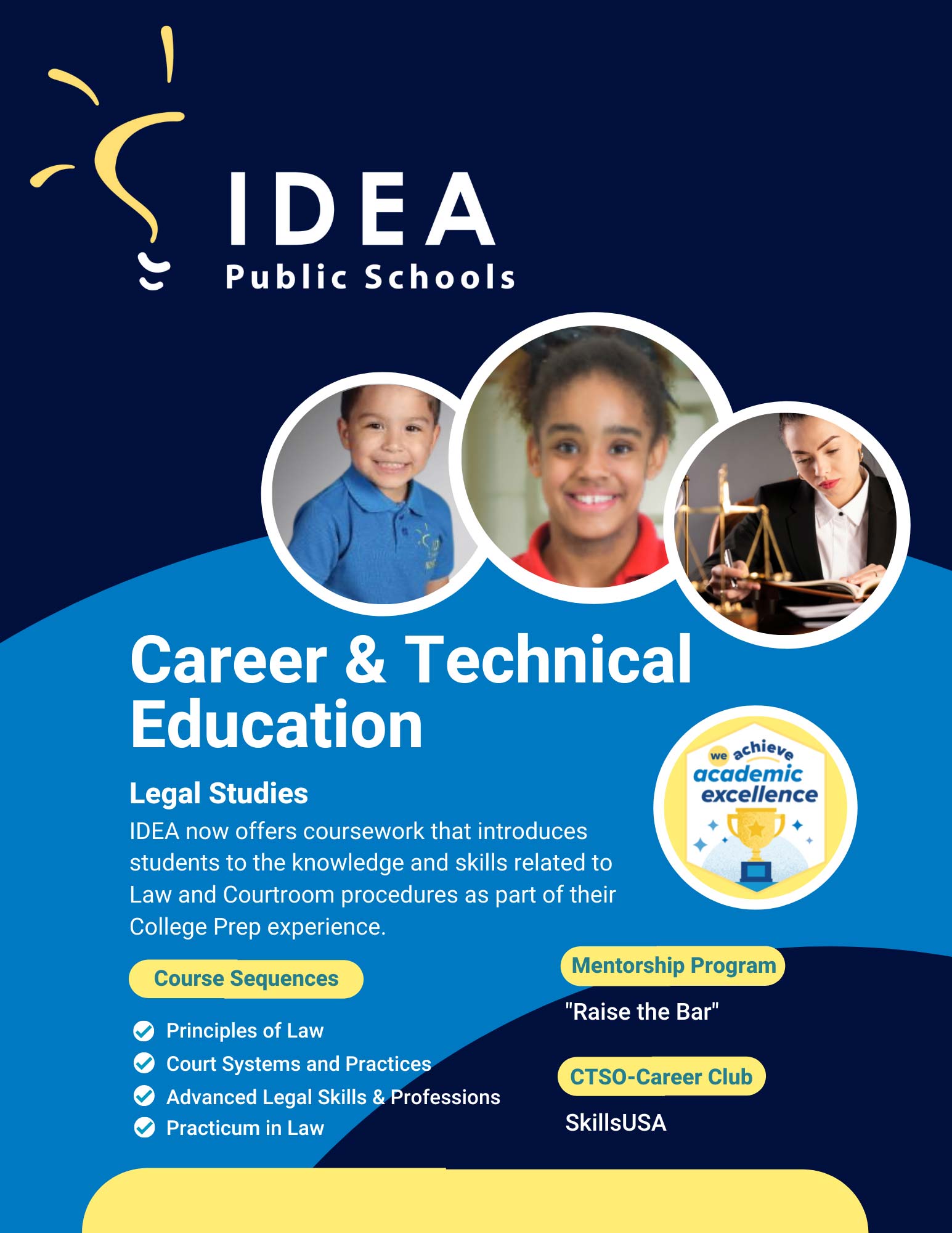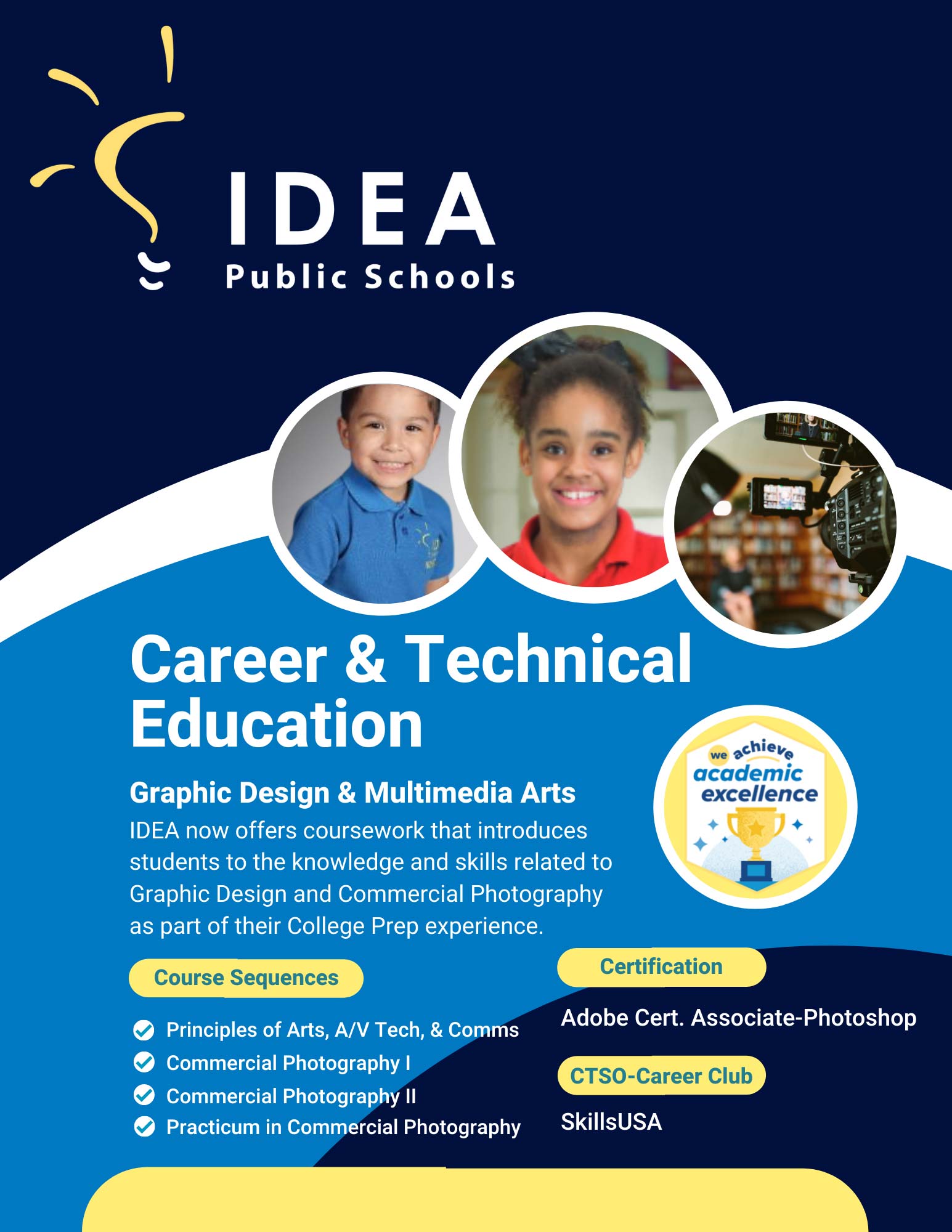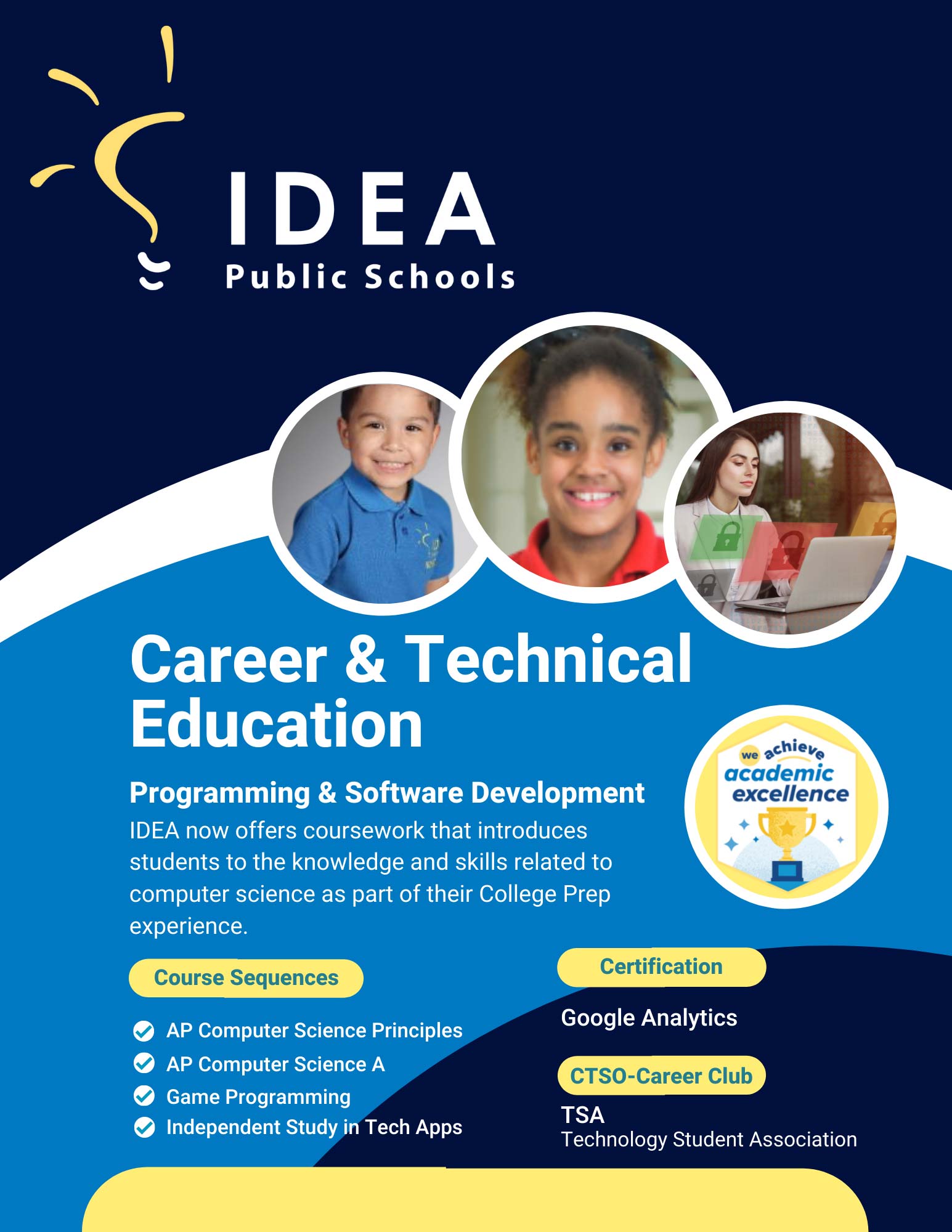 CTE at IDEA enhances our college for all mission, allowing students to explore career fields that mirror the job market and landscape of our nation’s economic growth. Students use these experiences to select the Major and University that will equip them for life beyond our classrooms.